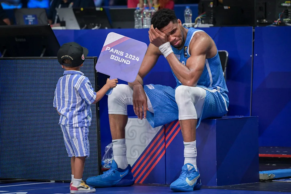 With his son Maverick by his side, Milwaukee Bucks star Giannis Antetokoumpo gets emotional after Team Greece qualified for the the Paris 2024 Olympics on July 7, 2024.
