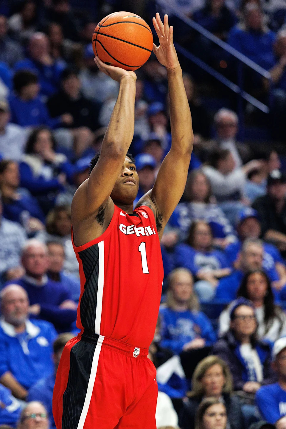 Feb 17, 2026; Lexington, Kentucky, USA; Georgia Bulldogs forward Kareem Stagg (1) shoots the ball during the first half against the Kentucky Wildcats at Rupp Arena at Central Bank Center. Mandatory Credit: Jordan Prather-Imagn Images