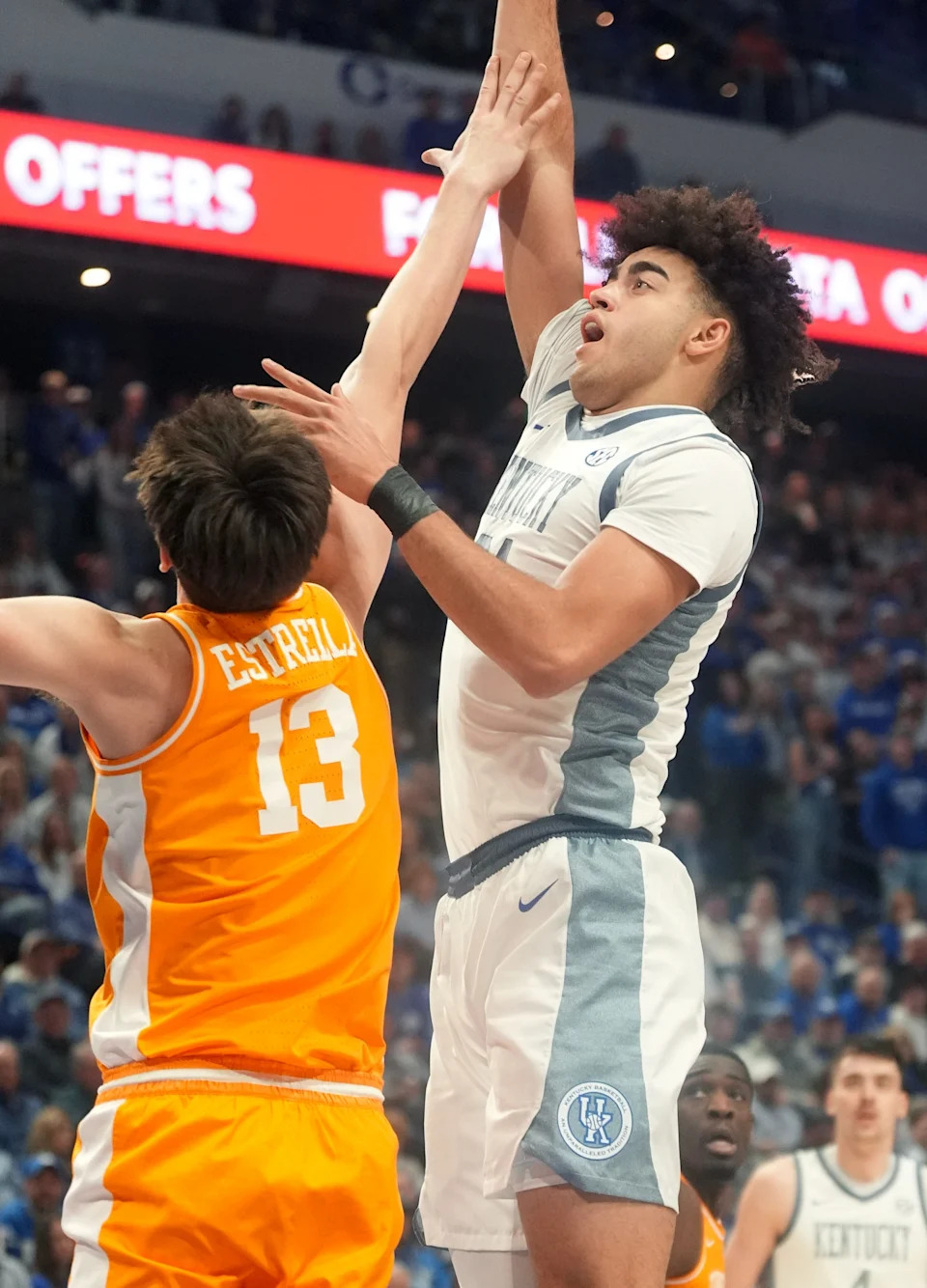 Kentucky’s guard Otega Oweh (00) scores against Tennessee’s forward J.P. Estrella (13) at Rupp Arena Saturday night.
