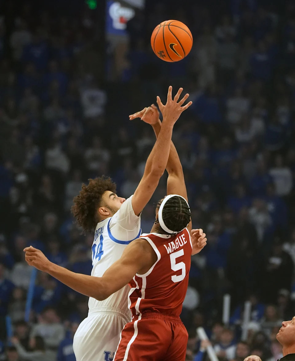 Kentucky’s center Malachi Moreno (24) fights for the tip off against Oklahoma’s Mohamed Wague Wednesday night at Rupp Arena.
