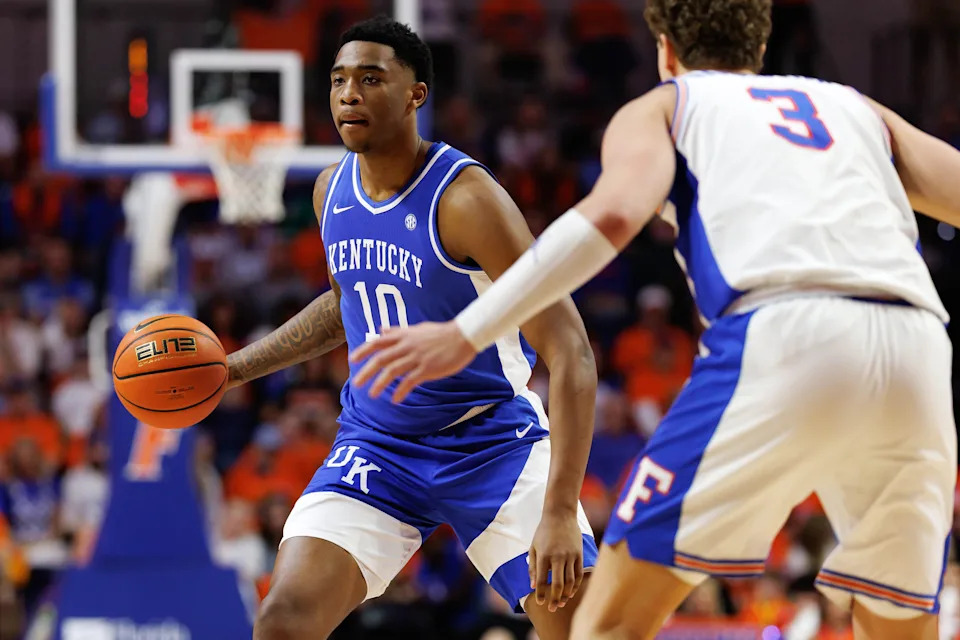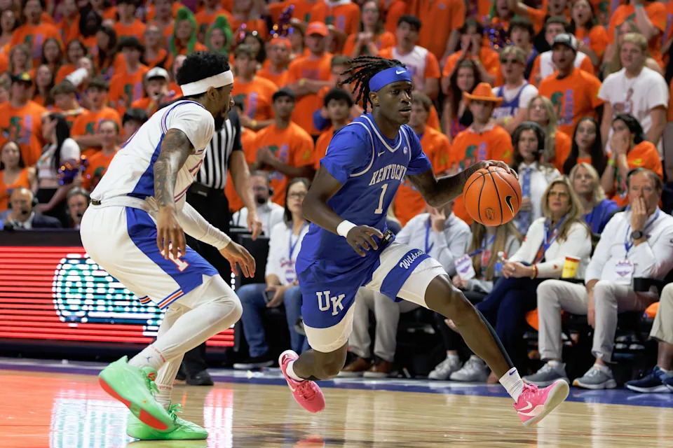 Feb 14, 2026; Gainesville, Florida, USA; Kentucky Wildcats guard Denzel Aberdeen (1) drives to the basket past Florida Gators guard Boogie Fland (0) during the first half at Exactech Arena at the Stephen C. O’Connell Center. Mandatory Credit: Matt Pendleton-Imagn Images