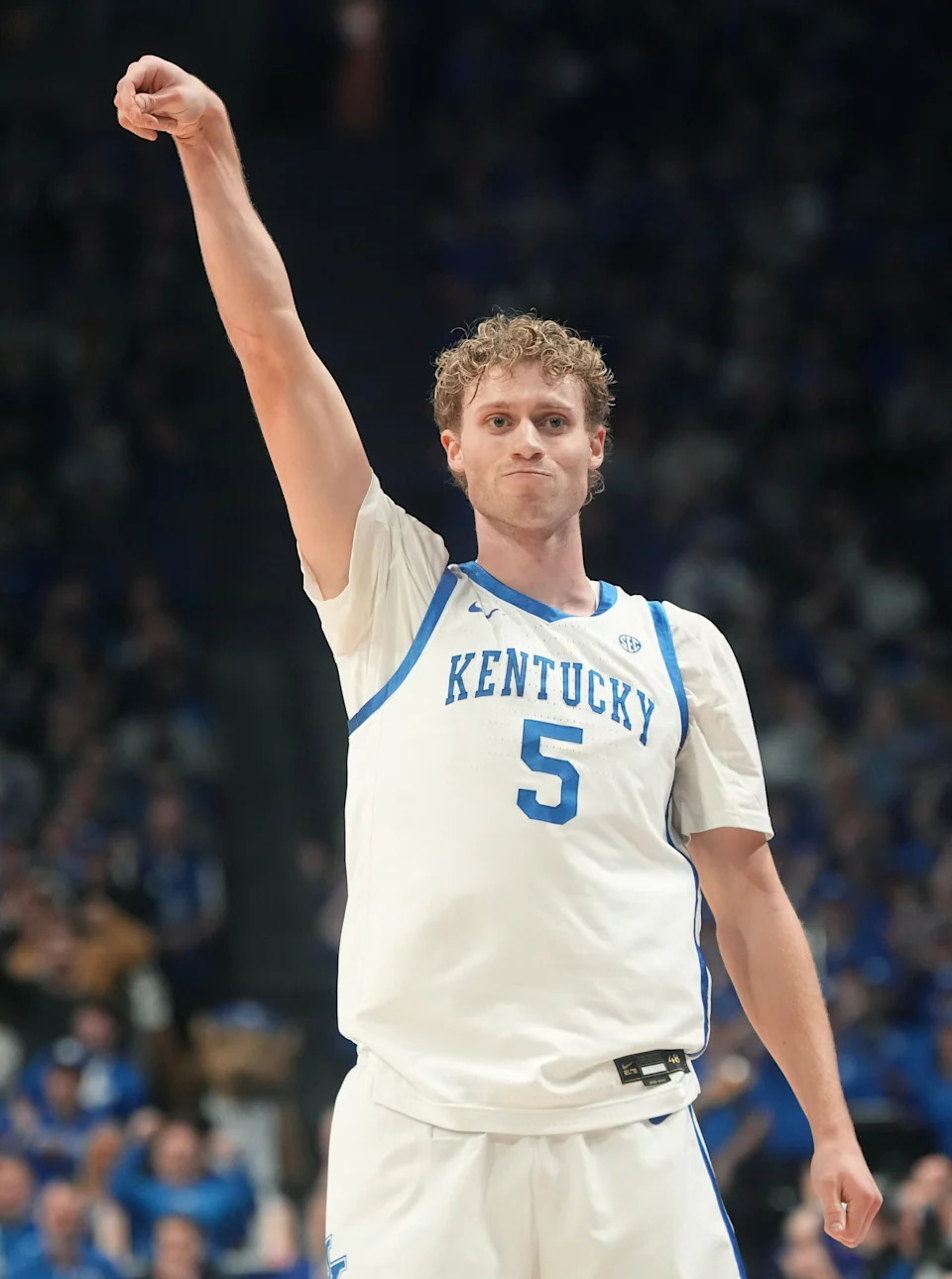 Kentucky’s guard Collin Chandler (5) celebrated making a three against Oklahoma Wednesday night at Rupp Arena.