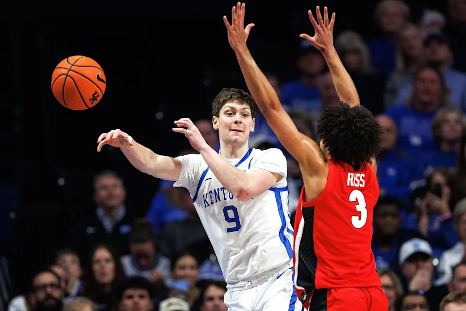 Feb 17, 2026; Lexington, Kentucky, USA; Kentucky Wildcats forward Trent Noah (9) passes the ball during the first half against the Georgia Bulldogs at Rupp Arena at Central Bank Center. Mandatory Credit: Jordan Prather-Imagn Images