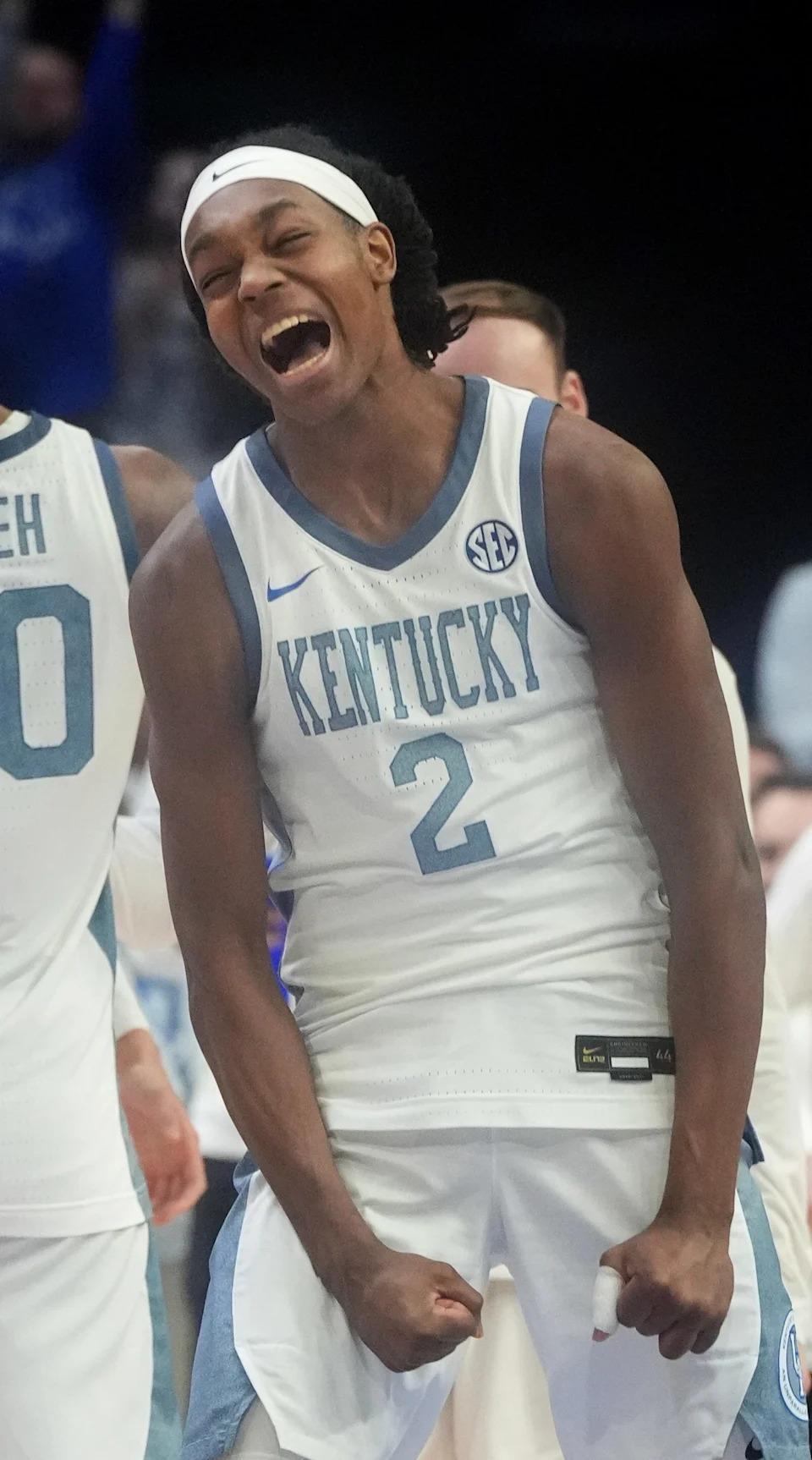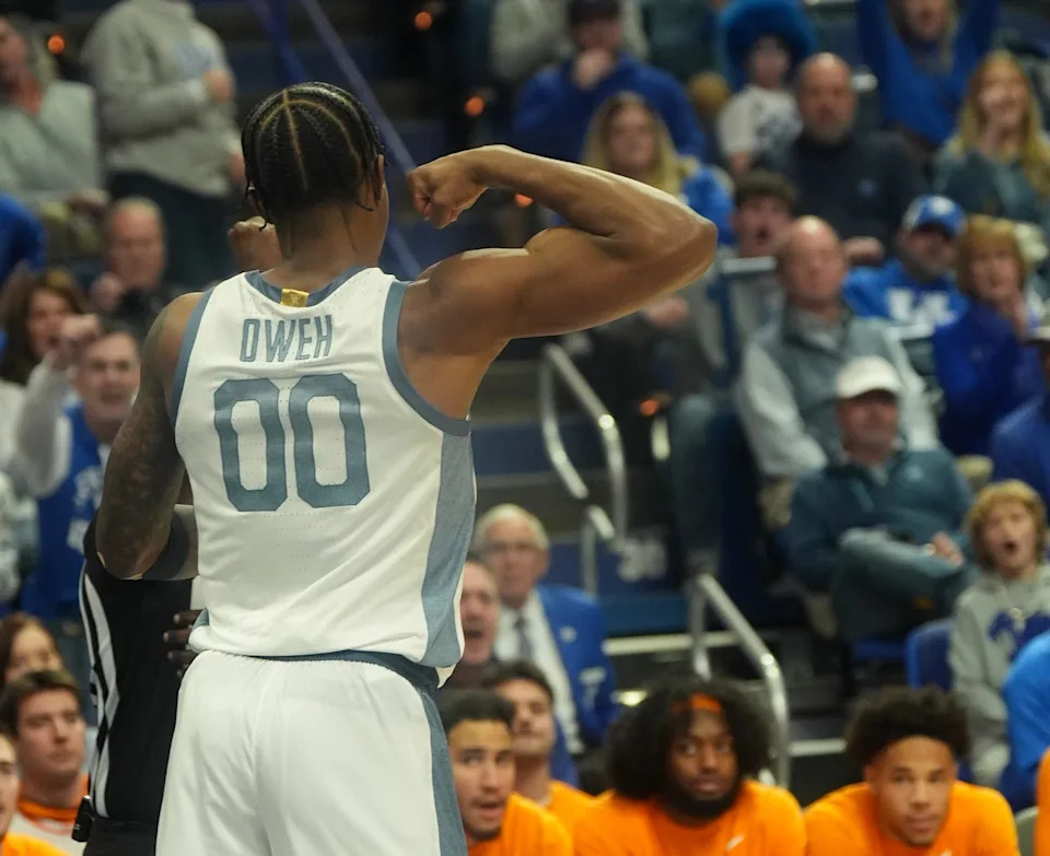 Kentucky’s guard Otega Oweh (00) celebrates scoring against Tennessee at Rupp Arena Saturday night.