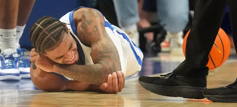 Kentucky’s guard Otega Oweh (00) takes a minute for injury against Oklahoma Wednesday night at Rupp Arena.