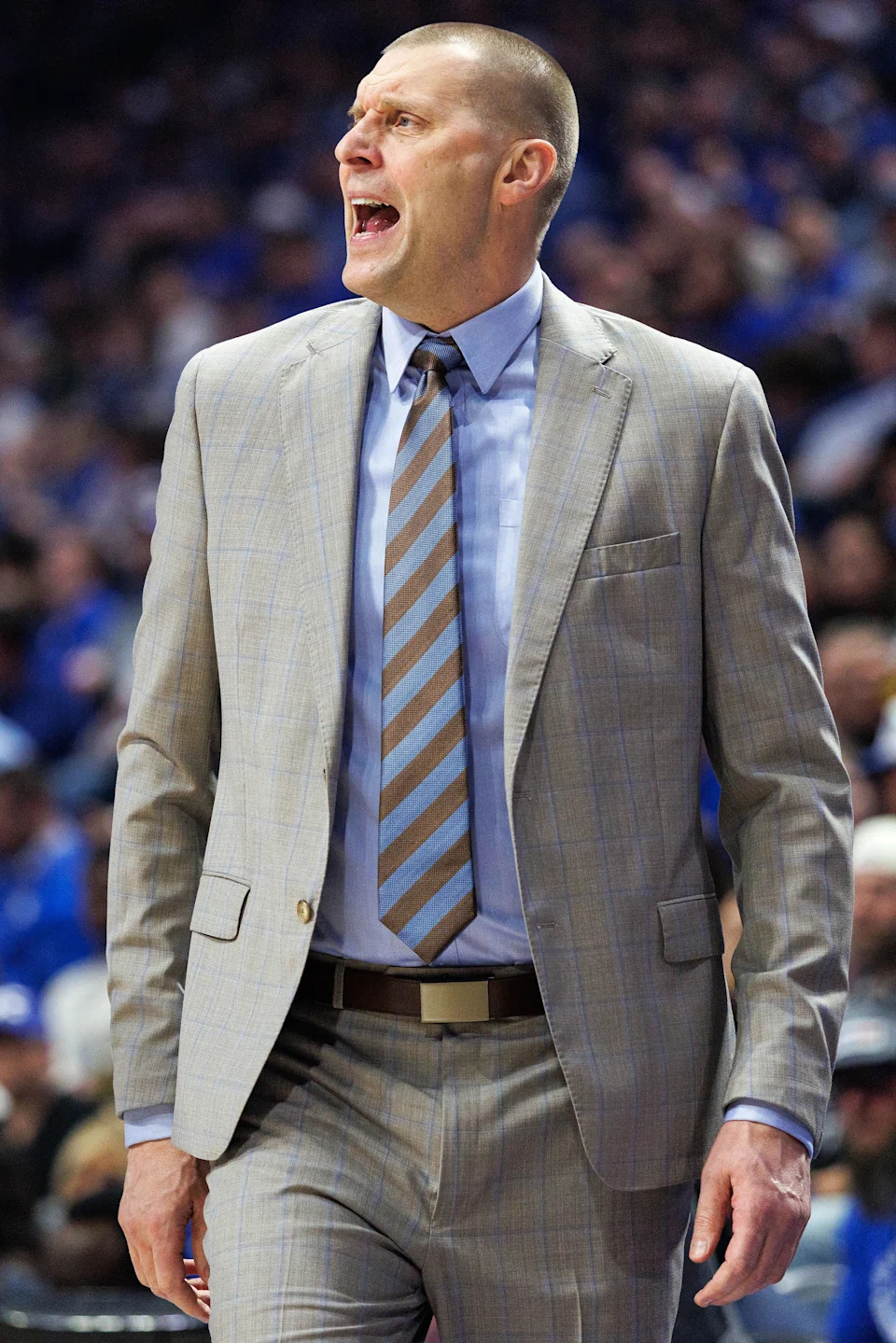 Feb 17, 2026; Lexington, Kentucky, USA; Kentucky Wildcats head coach Mark Pope yells to his players during the first half against the Georgia Bulldogs at Rupp Arena at Central Bank Center. Mandatory Credit: Jordan Prather-Imagn Images