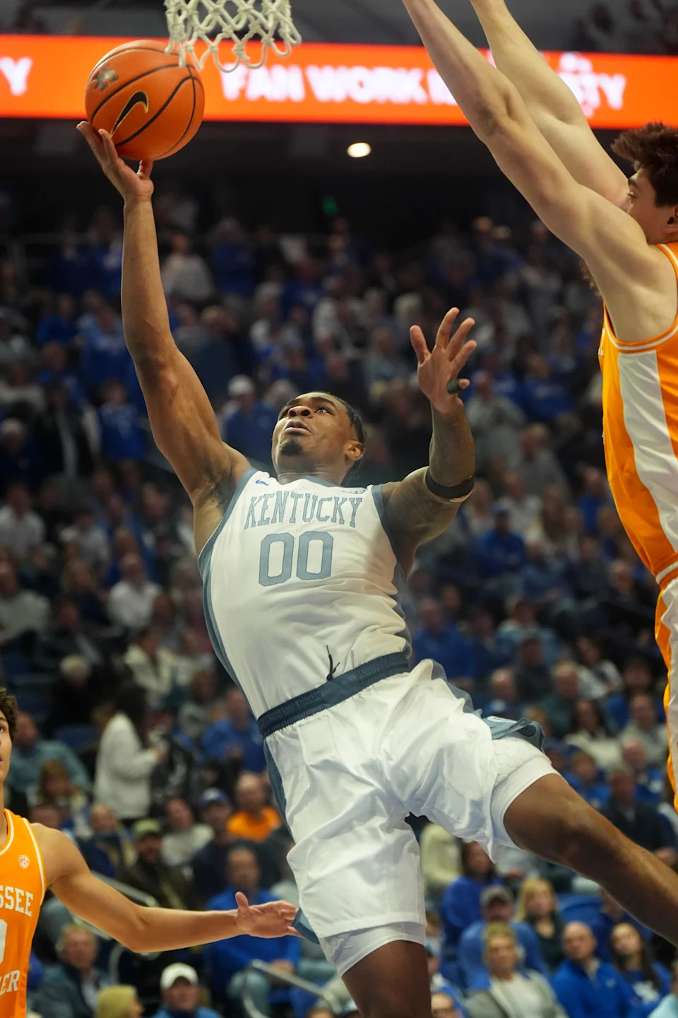 Kentucky’s guard Otega Oweh (00) scores against Tennessee’s guard Bishop Boswell (3) at Rupp Arena Saturday night.