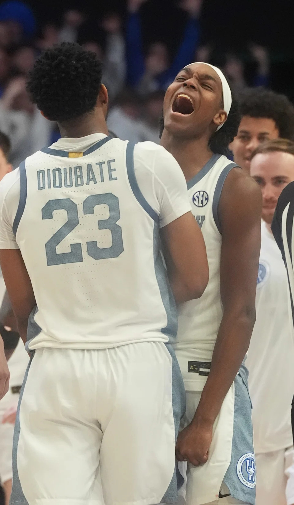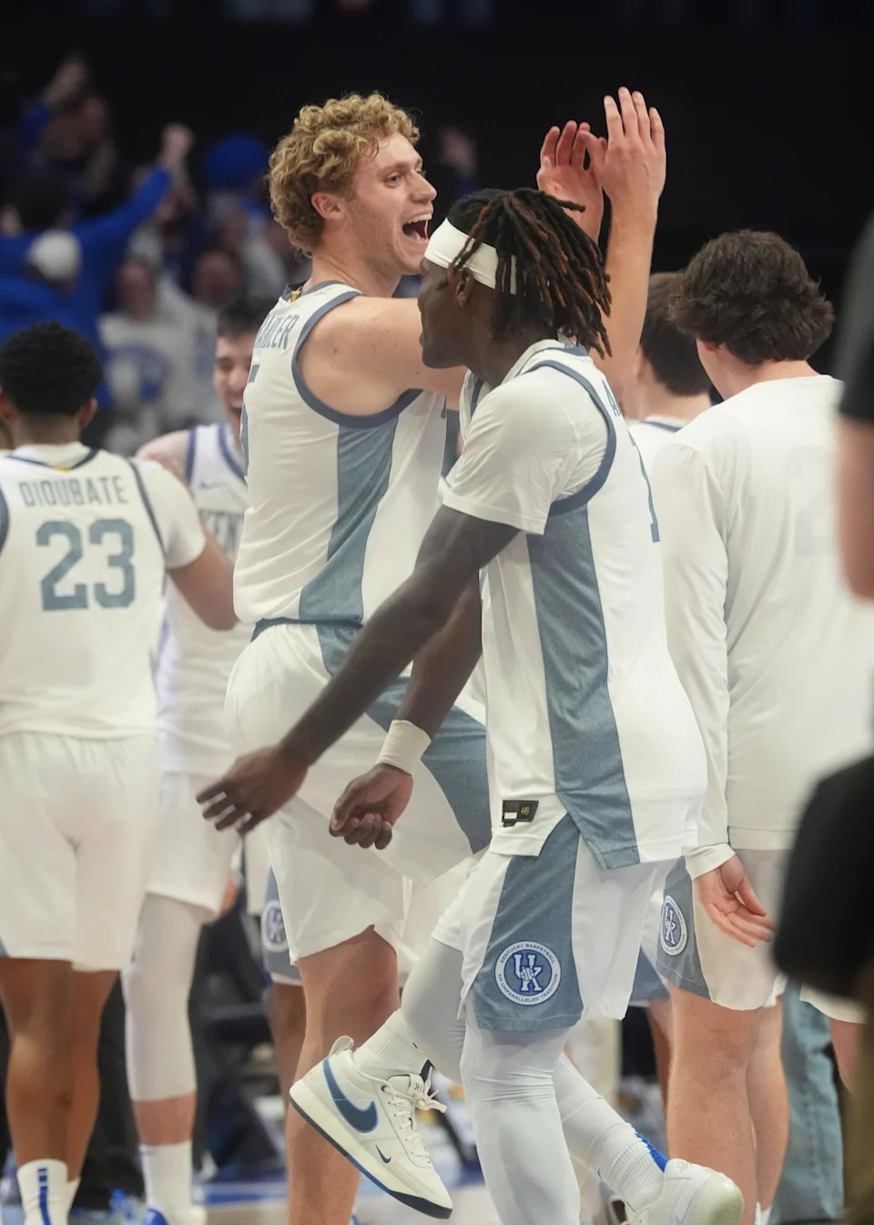 Kentucky’s forward Mouhamed Dioubate (23) and Jasper Johnson (2) celebrate beating Tennessee at Rupp Arena Saturday night.