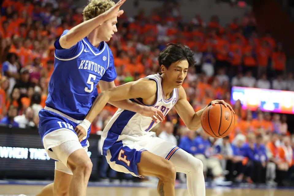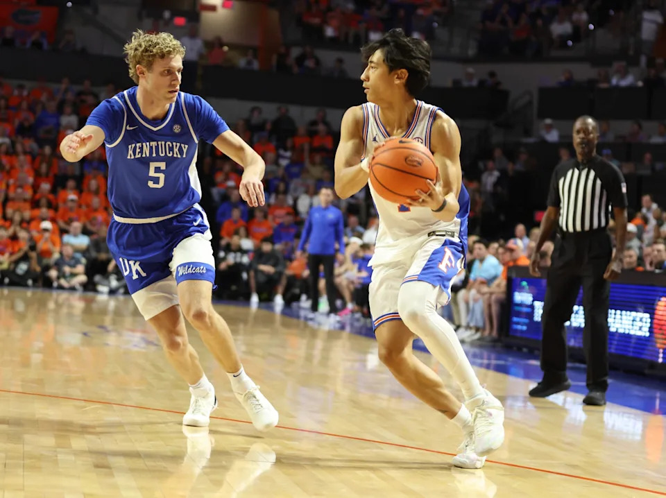 Florida guard Xaivian Lee (1) drives past Kentucky guard Collin Chandler (5) during the first half of a NCAA mens basketball game at Steven C. O’Connell Center Exactek arena in Gainesville, FL on Saturday, February 14, 2026. [Alan Youngblood/Gainesville Sun]