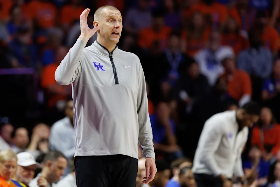 Feb 14, 2026; Gainesville, Florida, USA; Kentucky Wildcats head coach Mark Pope gestures against the Florida Gators during the first half at Exactech Arena at the Stephen C. O’Connell Center. Mandatory Credit: Matt Pendleton-Imagn Images