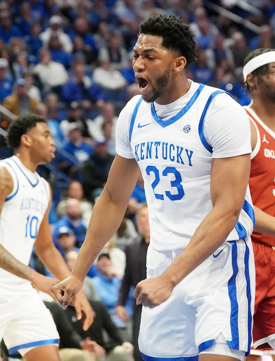 Kentucky’s forward Mouhamed Dioubate (23) celebrates making the shot against Oklahoma’s Mohamed Wague (5) and Derrion Reid (35) Wednesday night at Rupp Arena.