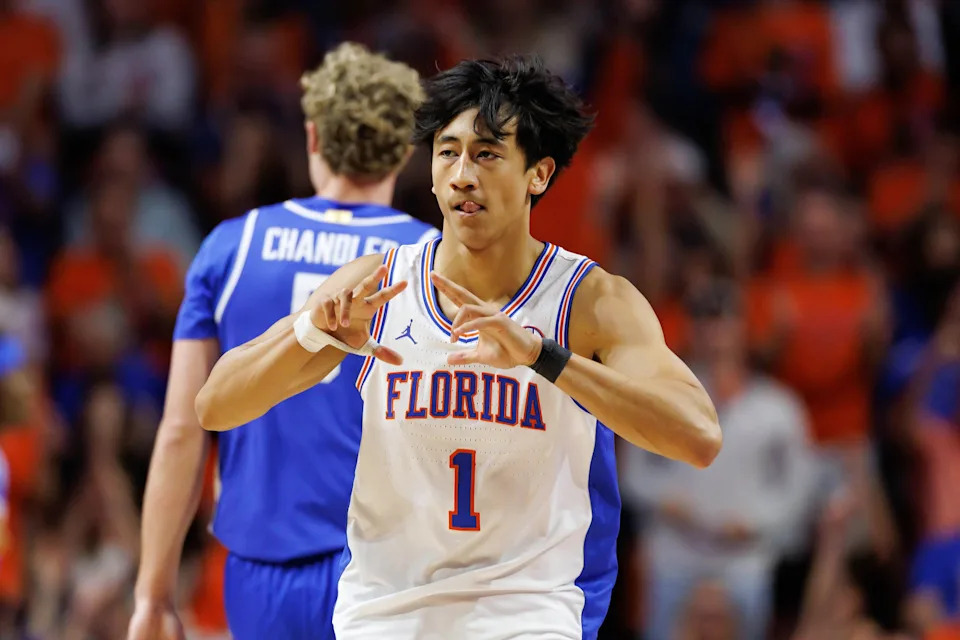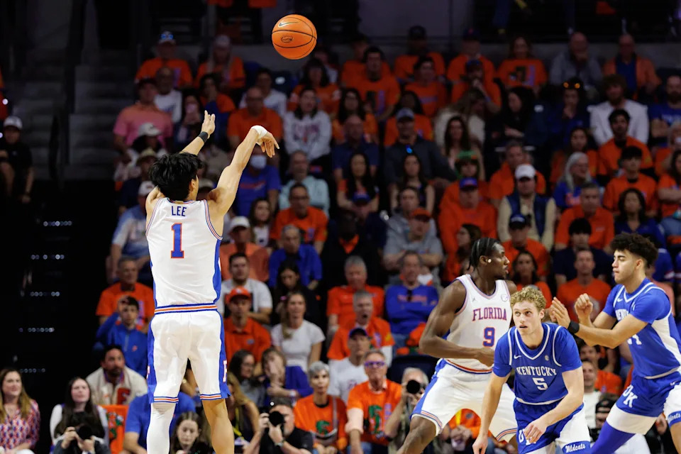 Feb 14, 2026; Gainesville, Florida, USA; Florida Gators guard Xaivian Lee (1) makes a three point basket over Kentucky Wildcats guard Collin Chandler (5) during the first half at Exactech Arena at the Stephen C. O’Connell Center. Mandatory Credit: Matt Pendleton-Imagn Images