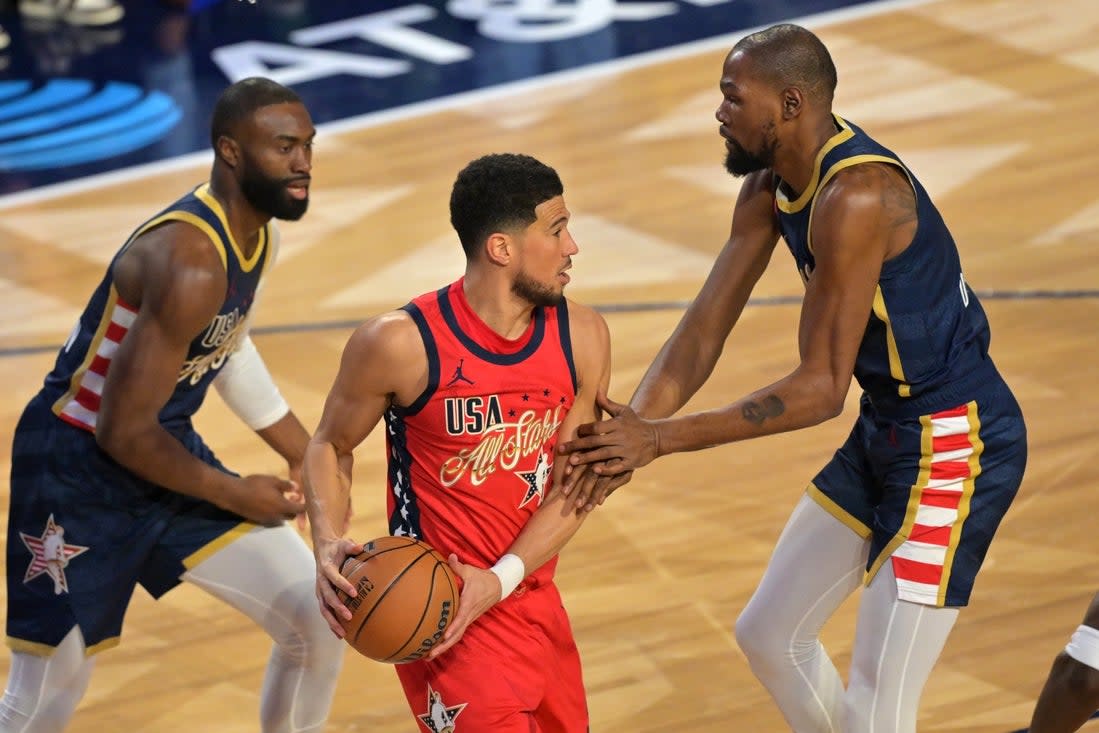Feb 15, 2026; Inglewood, California, USA; Team USA Stars guard Devin Booker (1) of the Phoenix Suns controls the ball against Team USA Stripes forward Kevin Durant (35) of the Houston Rockets in game two during the 75th NBA All Star Game at Intuit Dome. Mandatory Credit: Jayne Kamin-Oncea-Imagn Images