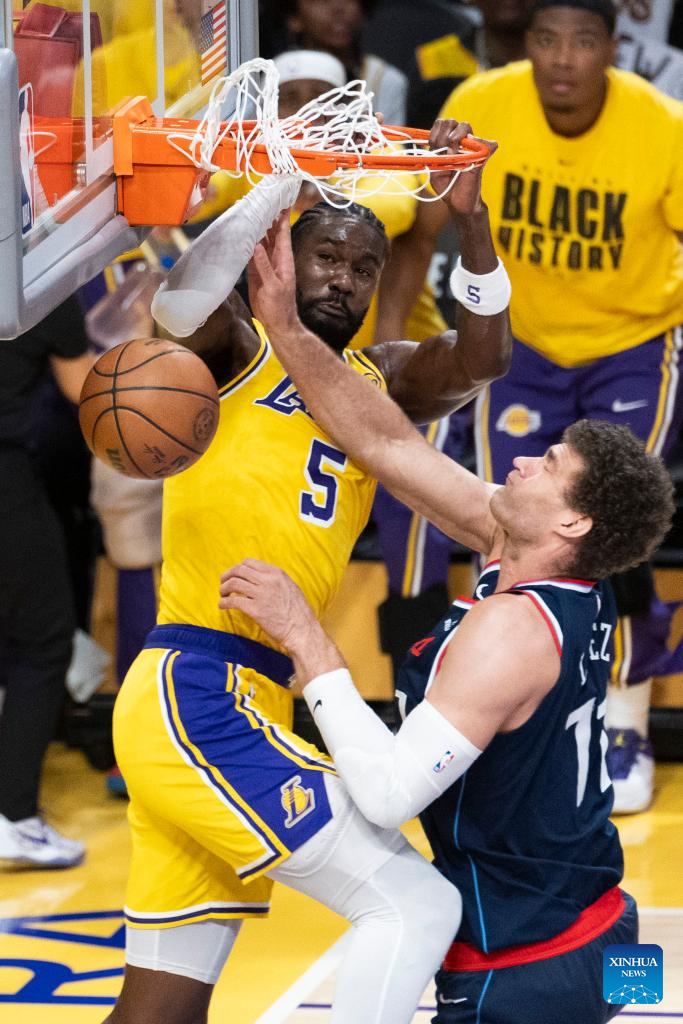 Los Angeles Lakers’ Deandre Ayton (L) dunks against Los Angeles Clippers’ Brook Lopez during the 2025-2026 NBA regular season basketball game between Los Angeles Lakers and Los Angeles Clippers in Los Angeles, the United States, Feb. 20, 2026. (Photo by Ringo Chiu/Xinhua)