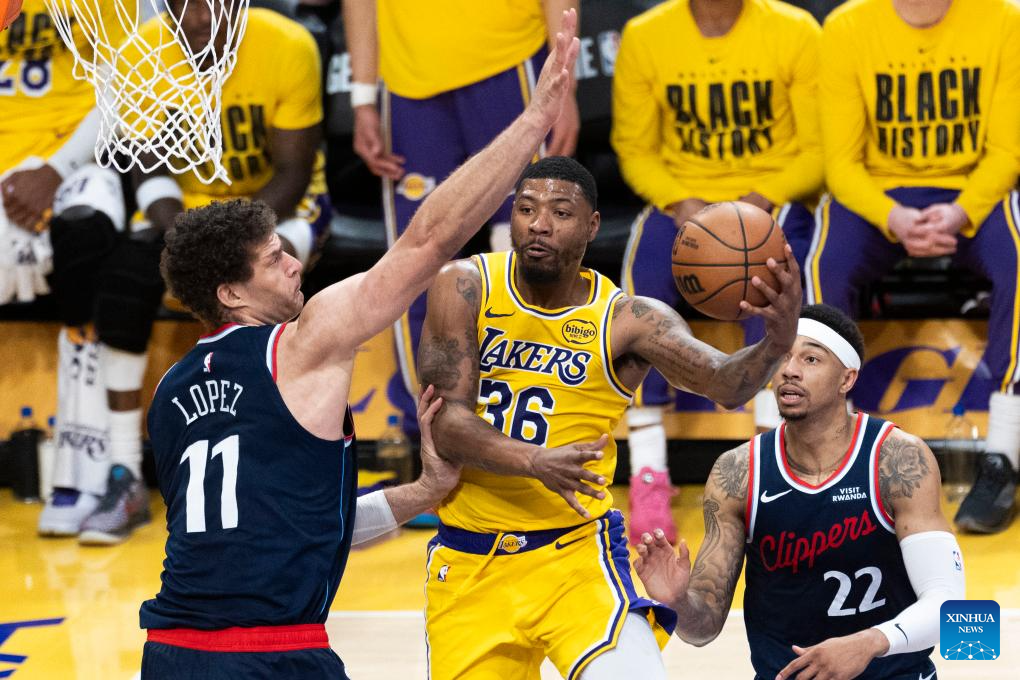 Los Angeles Clippers’ Brook Lopez (L) blocks Los Angeles Lakers’ Marcus Smart (C) during the 2025-2026 NBA regular season basketball game between Los Angeles Lakers and Los Angeles Clippers in Los Angeles, the United States, Feb. 20, 2026. (Photo by Ringo Chiu/Xinhua)