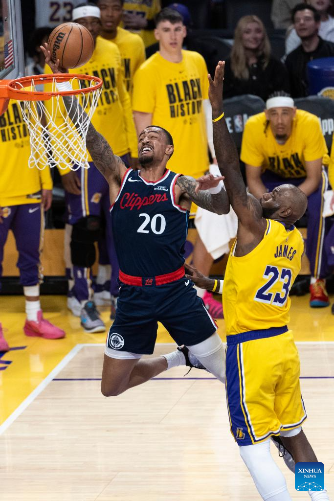 Los Angeles Clippers’ John Collins (L) goes for a layup during the 2025-2026 NBA regular season basketball game between Los Angeles Lakers and Los Angeles Clippers in Los Angeles, the United States, Feb. 20, 2026. (Photo by Ringo Chiu/Xinhua)