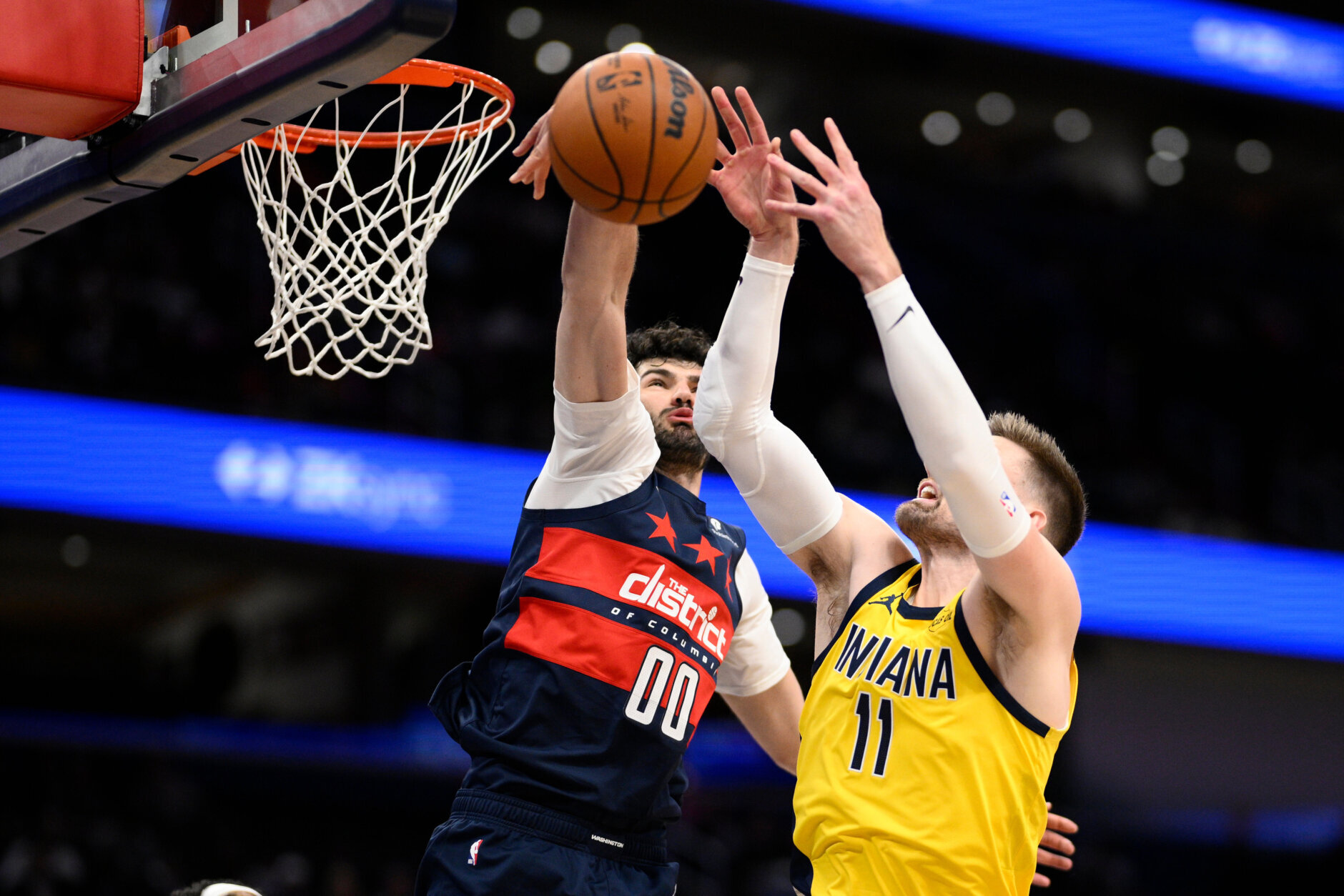 Pacers Wizards Basketball Washington Wizards forward Tristan Vukcevic (00) blocks Indiana Pacers center Micah Potter (11) during the first half of an NBA basketball game, Friday, Feb. 20, 2026, in Washington. (AP Photo/Nick Wass)