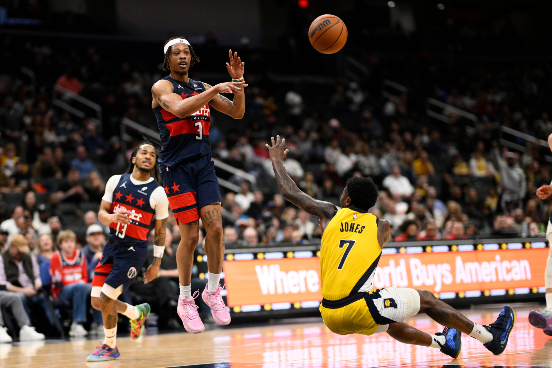 Pacers Wizards Basketball Washington Wizards guard Alondes Williams, second from left, passes the ball against Indiana Pacers guard Kam Jones (7) during the second half of an NBA basketball game, Friday, Feb. 20, 2026, in Washington. (AP Photo/Nick Wass)