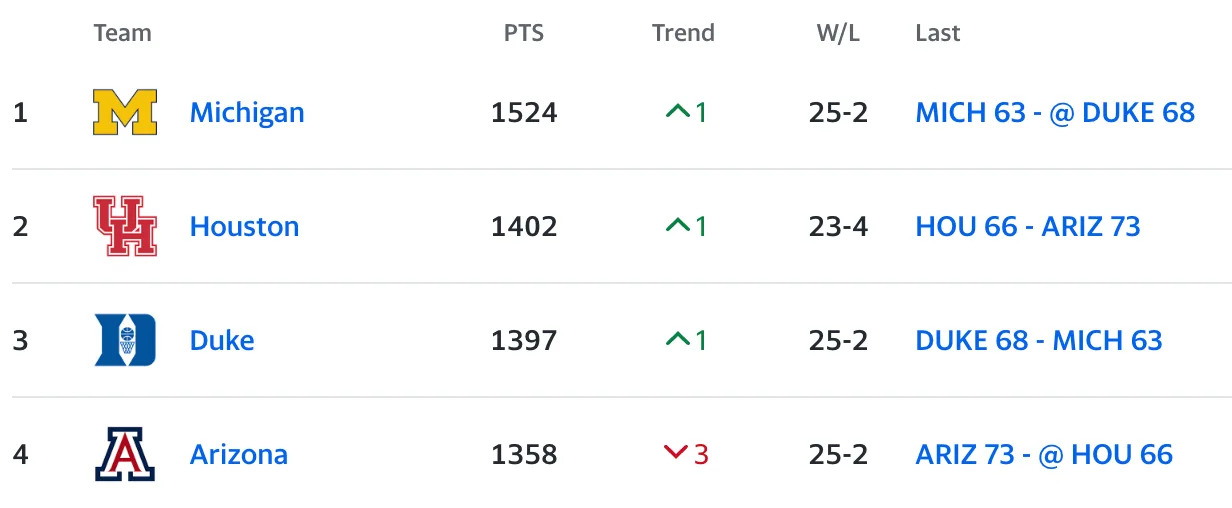 With No. 1 Michigan and No. 2 Houston going down today, it’s likely No. 3 Duke will leap ahead to the top spot in the AP Top 25.