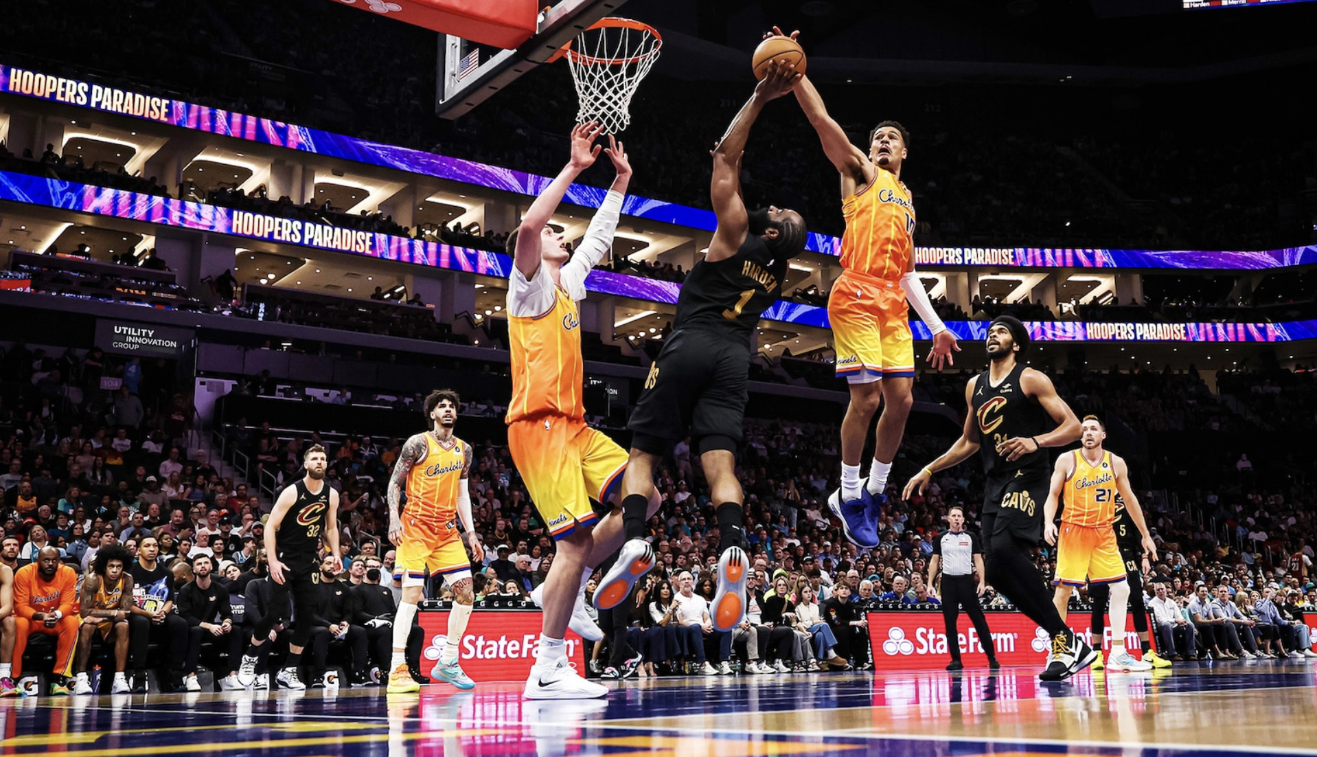 Charlotte Hornets guard Josh Green blocks the shot of Cleveland’s James Harden in a 118-113 loss Feb. 20 at Spectrum Center. The Hornets are 1-2 since losing Miles Bridges and Moussa Diabate to four-game suspensions for fighting.