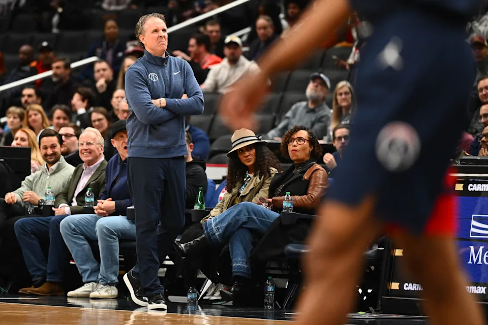 Feb 19, 2026; Washington, District of Columbia, USA; Washington Wizards head coach Brian Keefe looks on against the Indiana Pacers during the first half at Capital One Arena. Mandatory Credit: Brad Mills-Imagn Images
