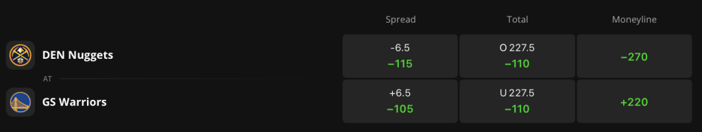 Looking at the odds for tonight, the Nuggets enter as 6.5-point favorites and hold -270 odds on the Moneyline on DraftKings Sportsbook. The Warriors hold +220 odds of winning outright with the game total set at 227.5 points.