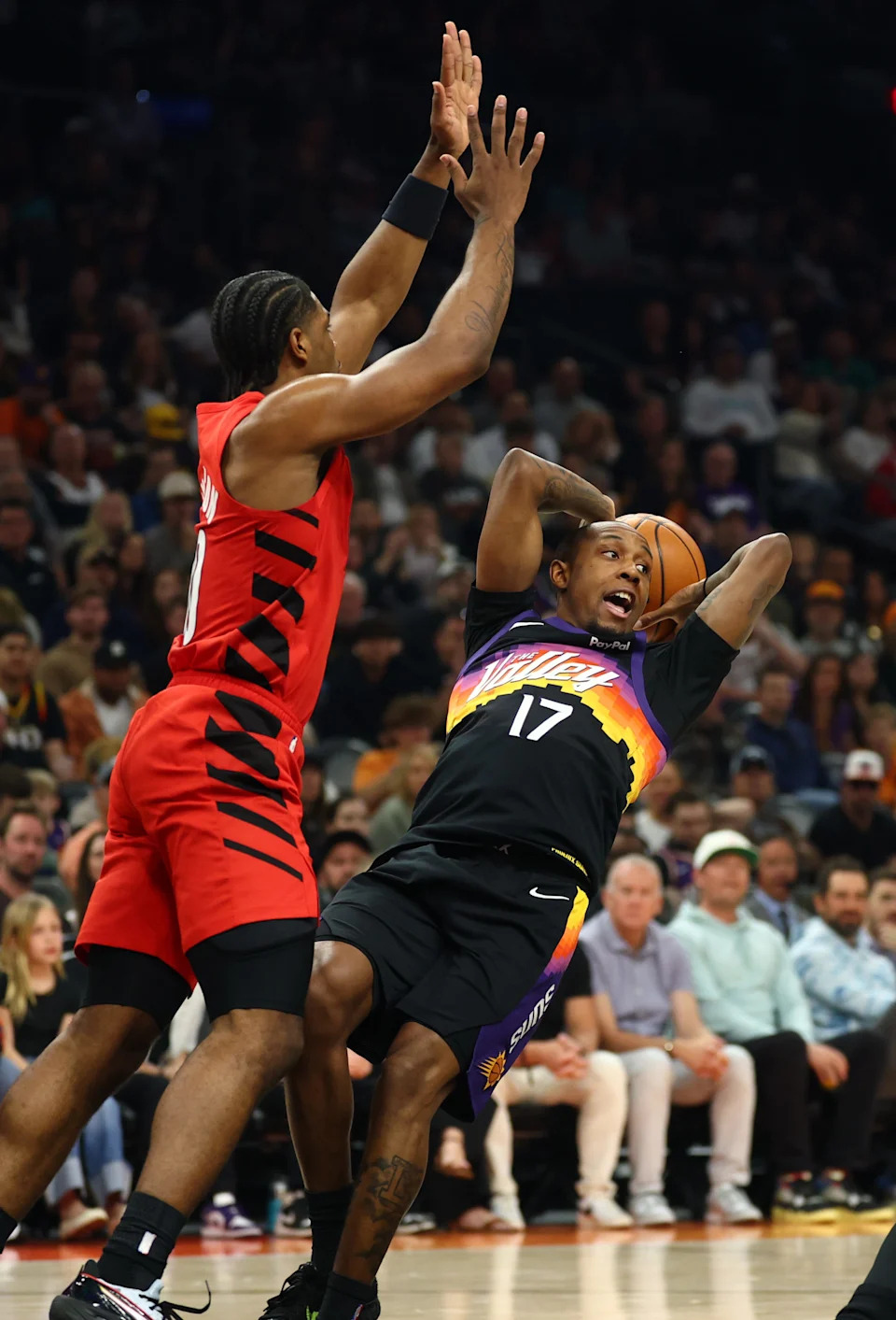 Phoenix Suns forward Jalen Green (right) shoots the ball against Portland Trail Blazers guard Matisse Thybulle in the first half at Mortgage Matchup Center in Phoenix on Feb. 22, 2026.