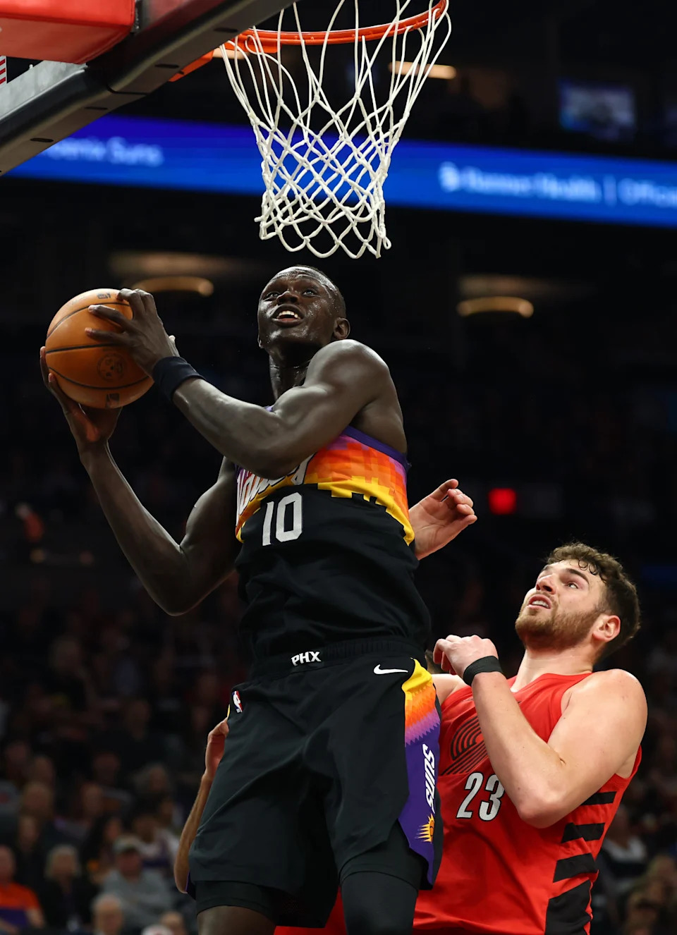 Phoenix Suns center Khaman Maluach (10) against Portland Trail Blazers center Donovan Clingan (23) in the first half at Mortgage Matchup Center in Phoenix on Feb. 22, 2026.