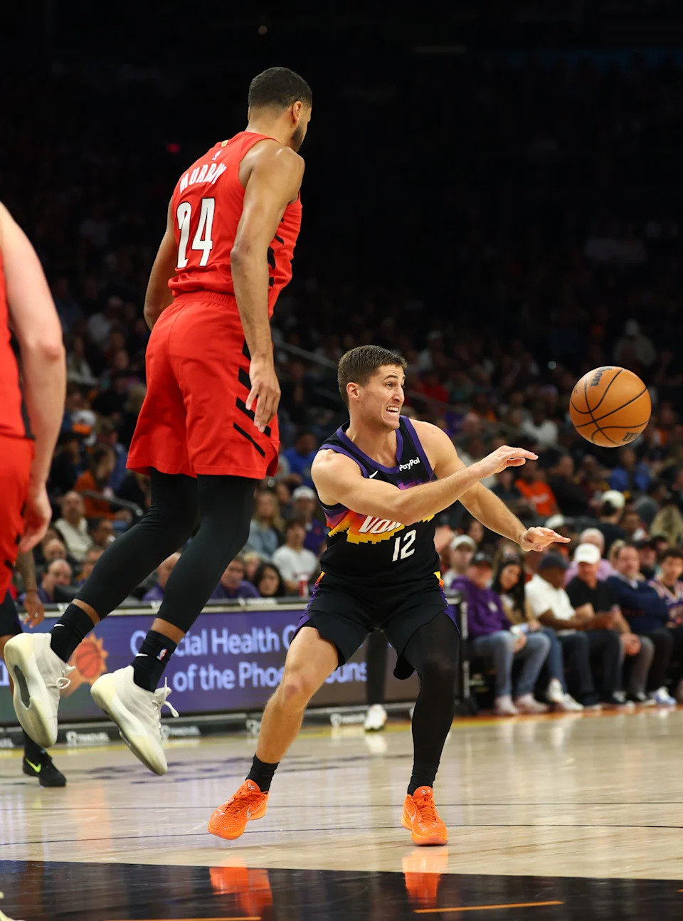 Phoenix Suns guard Collin Gillespie (12) passes the ball against Portland Trail Blazers forward Kris Murray (24) in the first half at Mortgage Matchup Center in Phoenix on Feb. 22, 2026.