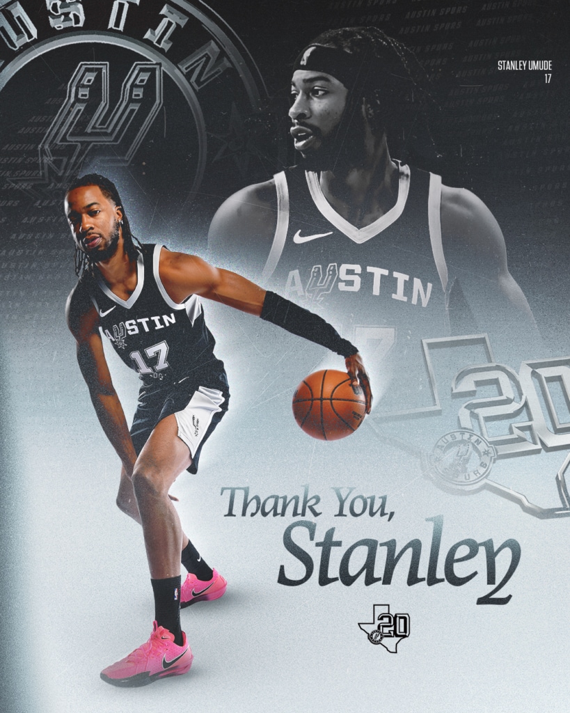 Umude, 6-6/210, appeared in two games with San Antonio this season. In 31 games with Austin, he averaged 18.2 points, 4.5 rebounds and 1.7 assists in 34.8 minutes.