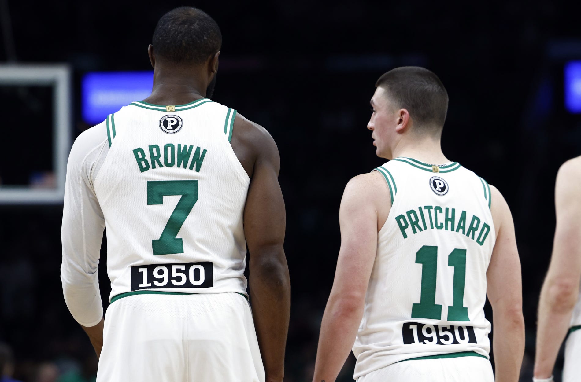 Jaylen Brown and Payton Pritchard have taken on more workload for the Boston Celtics with Jayson Tatum injured this season. (Danielle Parhizkaran/The Boston Globe via Getty Images)