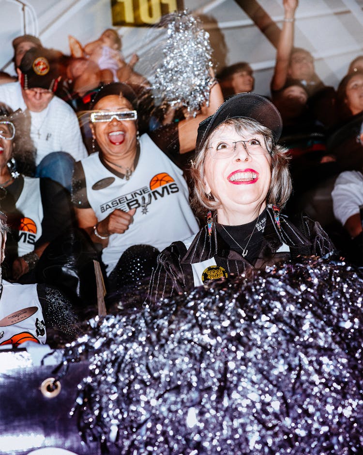 The Bums skew retired, but they are not leisurely fans. They arrive fully bedecked in Spurs gear—any surface that can be bedazzled in silver rhinestones has been thus bedazzled—and they are rabidly focused on the game. There is little chitchat when the ball is in play. During the first half, whenever the Spurs attempt free throws at the basket in front of the Bums’ section, the group sits at attention. “Hands up,” Esquivel says, and the Bums raise their arms, sausage-like inflatable thunder sticks stilled in each hand, and hold them there as if waiting for a drop on a roller coaster. Nobody moves or breathes until the player has (hopefully) made his shot, at which point Esquivel says “Swish!” and the Bums exhale as one. Then they stand and bonk their thunder sticks together and stretch to bonk those out of reach. I’m reminded of the part in some church services where parishioners rise and shake hands with their neighbors, saying “Peace be with you” to all, as though missing someone might doom them. I, not in possession of my own noisemaker, am dutifully booped by a succession of inflatable tubes.