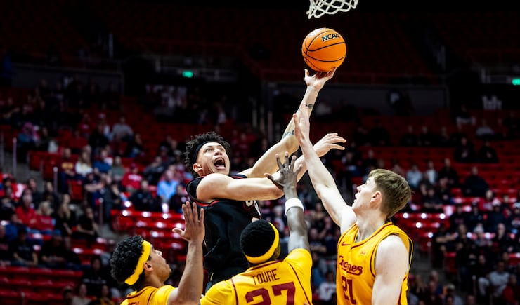 Utah forward James Okonkwo (32) lays the ball up while guarded by, from left, Iowa State guard Tamin Lipsey, guard Killyan Toure, and forward Dominykas Pleta during an NCAA basketball game held at the Huntsman Center in Salt Lake City on Tuesday, Feb. 24, 2026. | Isaac Hale, Deseret News