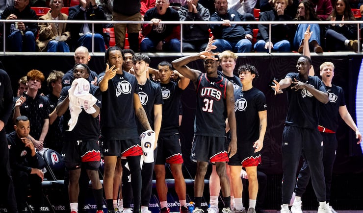 Utah players celebrate a teammate’s 3-pointer during an NCAA basketball game against Iowa State held at the Huntsman Center in Salt Lake City on Tuesday, Feb. 24, 2026. | Isaac Hale, Deseret News