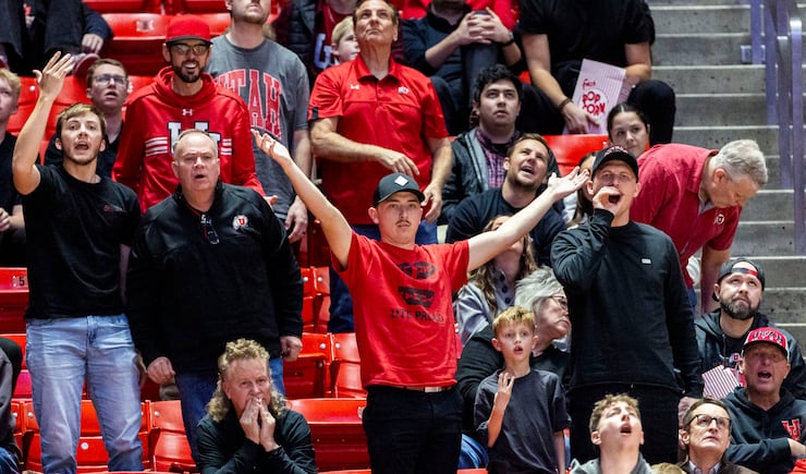 Utah fans protest a referee’s call during an NCAA basketball game against Iowa State held at the Huntsman Center in Salt Lake City on Tuesday, Feb. 24, 2026. | Isaac Hale, Deseret News