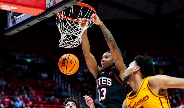 Utah forward Kendyl Sanders (13) dunks the ball past Iowa State forwards Milan Momcilovic, left, and Joshua Jefferson (5) during an NCAA basketball game held at the Huntsman Center in Salt Lake City on Tuesday, Feb. 24, 2026. | Isaac Hale, Deseret News