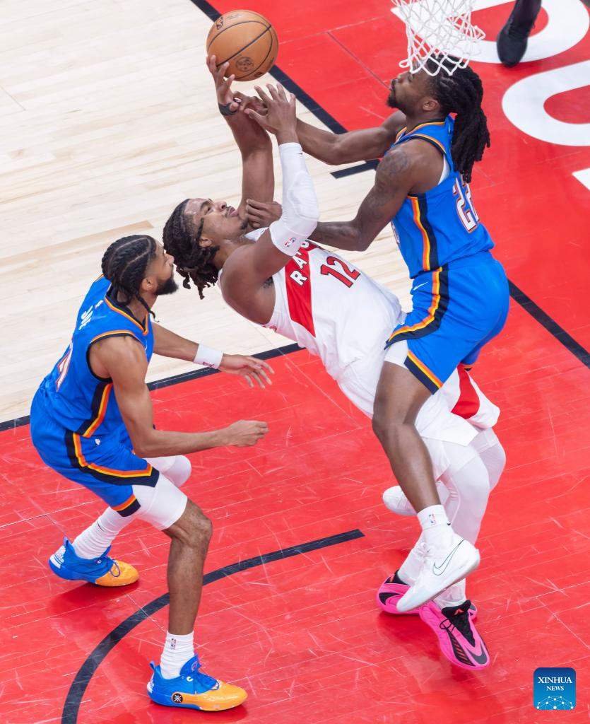 Collin Murray-Boyles (C) of Toronto Raptors vies with Cason Wallace (R) of Oklahoma City Thunder during the 2025-2026 NBA regular season game between Toronto Raptors and Oklahoma City Thunder in Toronto, Canada, on Feb. 24, 2026. (Photo by Zou Zheng/Xinhua)