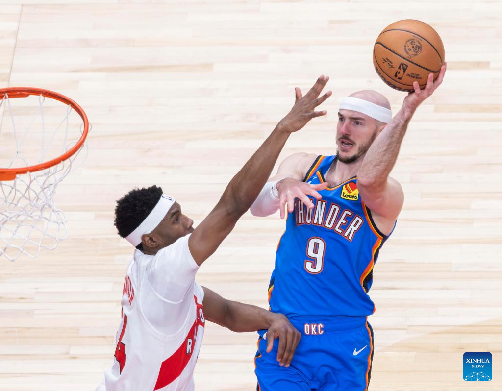 Alex Caruso (R) of Oklahoma City Thunder goes for a layup during the 2025-2026 NBA regular season game between Toronto Raptors and Oklahoma City Thunder in Toronto, Canada, on Feb. 24, 2026. (Photo by Zou Zheng/Xinhua)