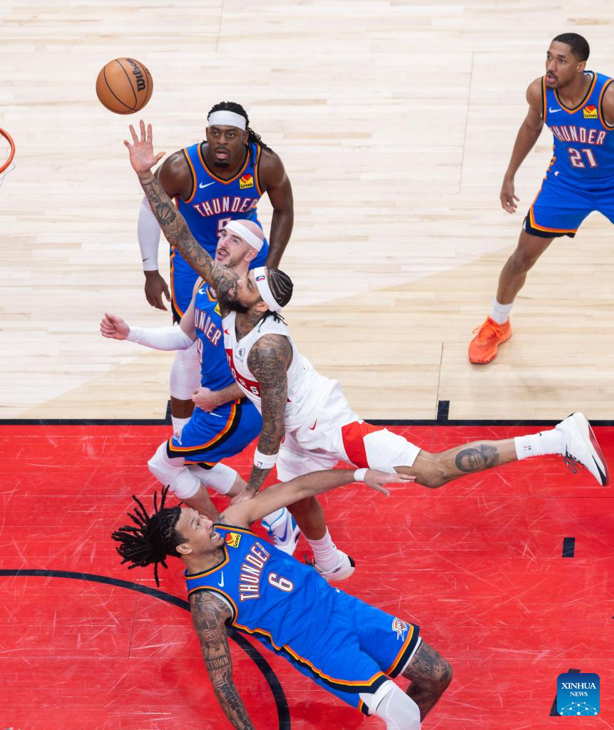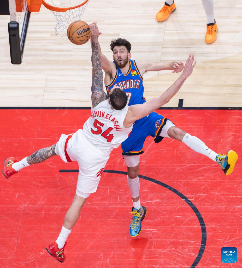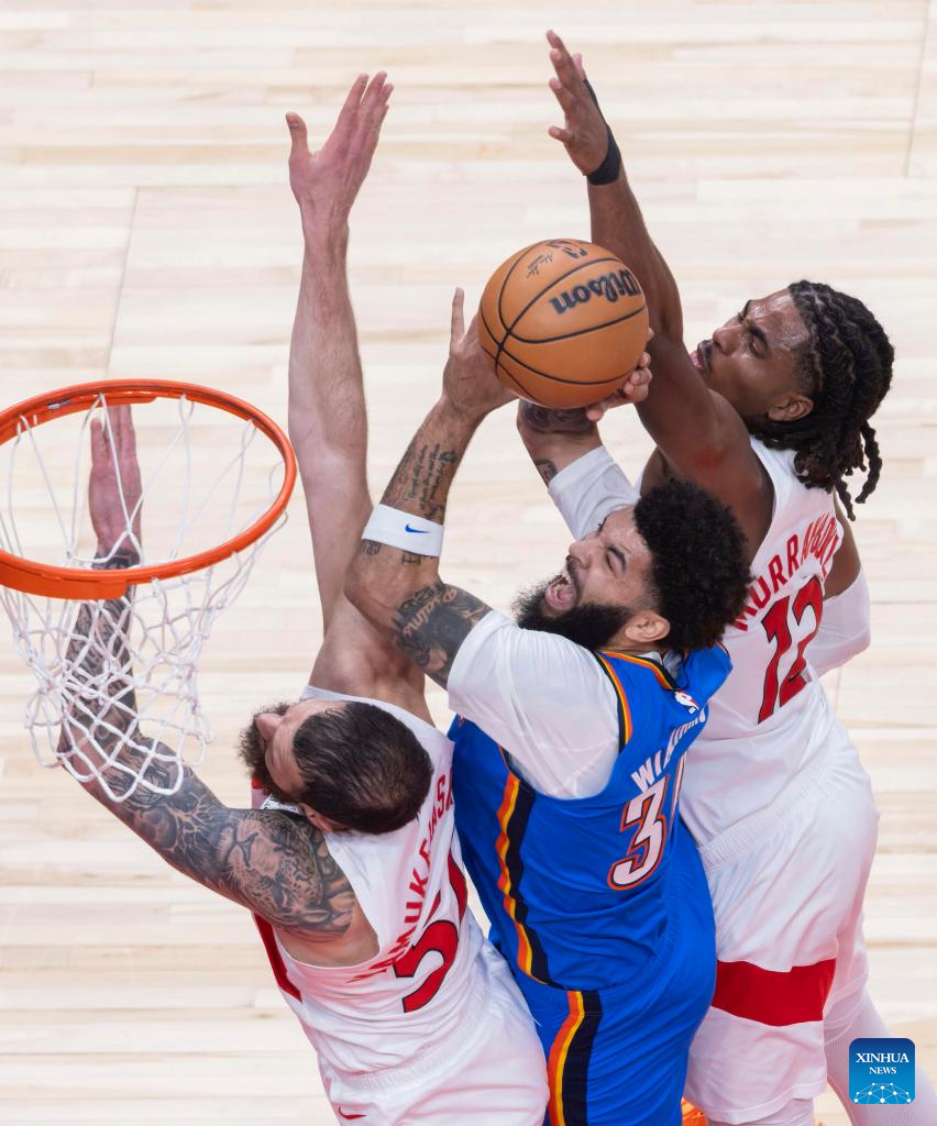 Collin Murray-Boyles (L) of Toronto Raptors fights for a rebound with Isaiah Hartenstein (C) of Oklahoma City Thunder during the 2025-2026 NBA regular season game between Toronto Raptors and Oklahoma City Thunder in Toronto, Canada, on Feb. 24, 2026. (Photo by Zou Zheng/Xinhua)