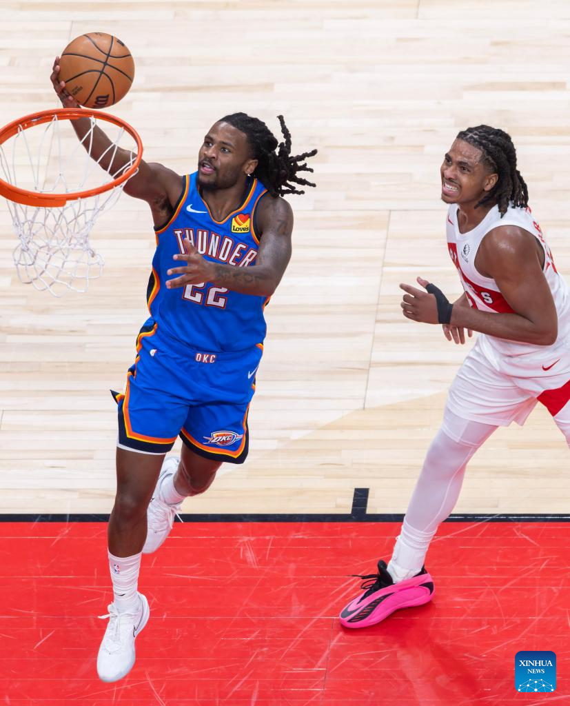 Cason Wallace (L) of Oklahoma City Thunder goes up for a layup during the 2025-2026 NBA regular season game between Toronto Raptors and Oklahoma City Thunder in Toronto, Canada, on Feb. 24, 2026. (Photo by Zou Zheng/Xinhua)