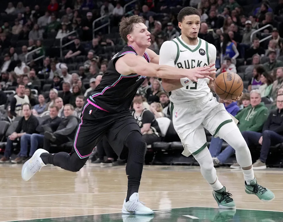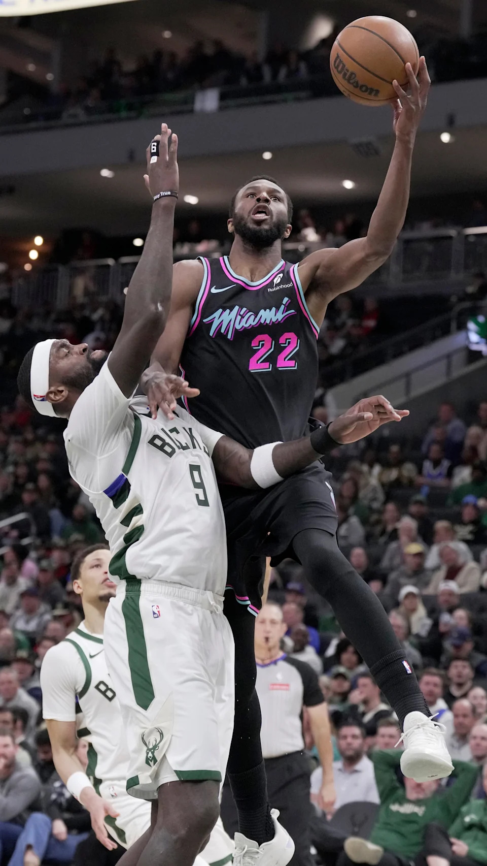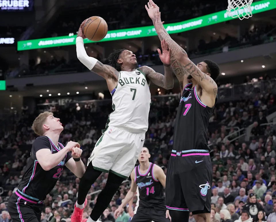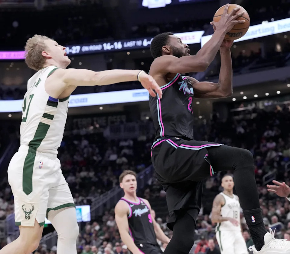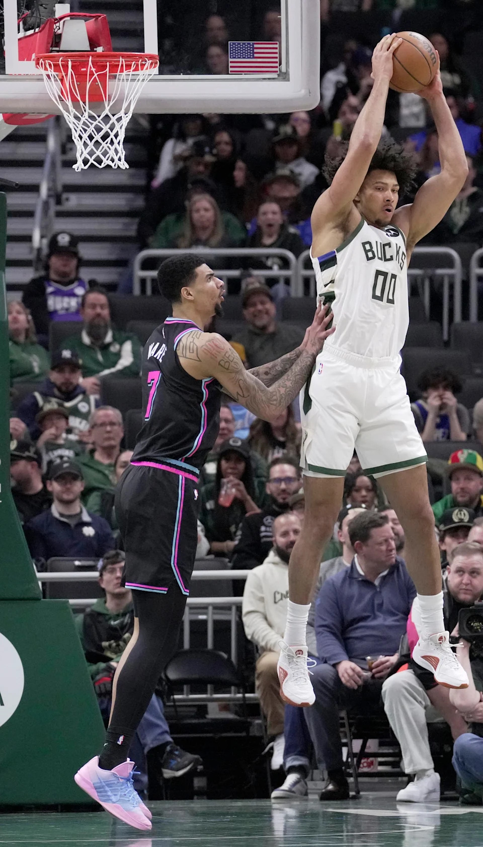Milwaukee Bucks center Jericho Sims (00) beats Miami Heat center Kel’el Ware (7) to a rebound during the first half of their game Tuesday, February 24, 2026 at Fiserv Forum in Milwaukee, Wisconsin.\