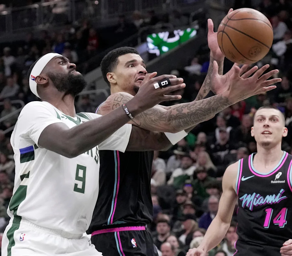 Milwaukee Bucks forward Bobby Portis (9) and Miami Heat center Kel’el Ware (7) vie for a rebound during the second half of their game Tuesday, February 24, 2026 at Fiserv Forum in Milwaukee, Wisconsin. The Milwaukee Bucks beat the Miami Heat 128-117.