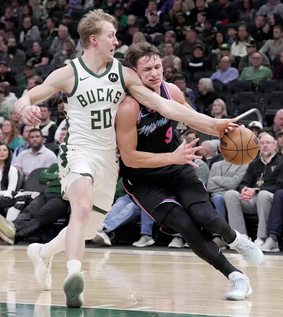 Miami Heat guard Pelle Larsson (9) guards Milwaukee Bucks guard Ryan Rollins (13) during the second half of their game Tuesday, February 24, 2026 at Fiserv Forum in Milwaukee, Wisconsin. The Milwaukee Bucks beat the Miami Heat 128-117.