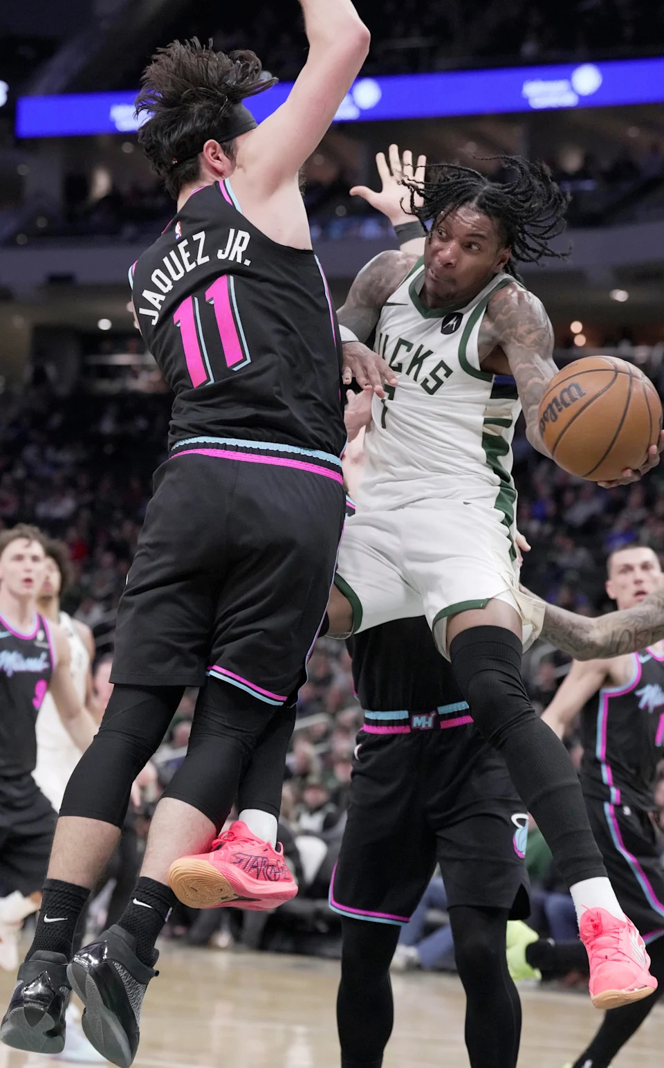 Milwaukee Bucks guard Kevin Porter Jr. (7) is fouled by Miami Heat center Kel’el Ware (7) during the second half of their game Tuesday, February 24, 2026 at Fiserv Forum in Milwaukee, Wisconsin. The Milwaukee Bucks beat the Miami Heat 128-117.