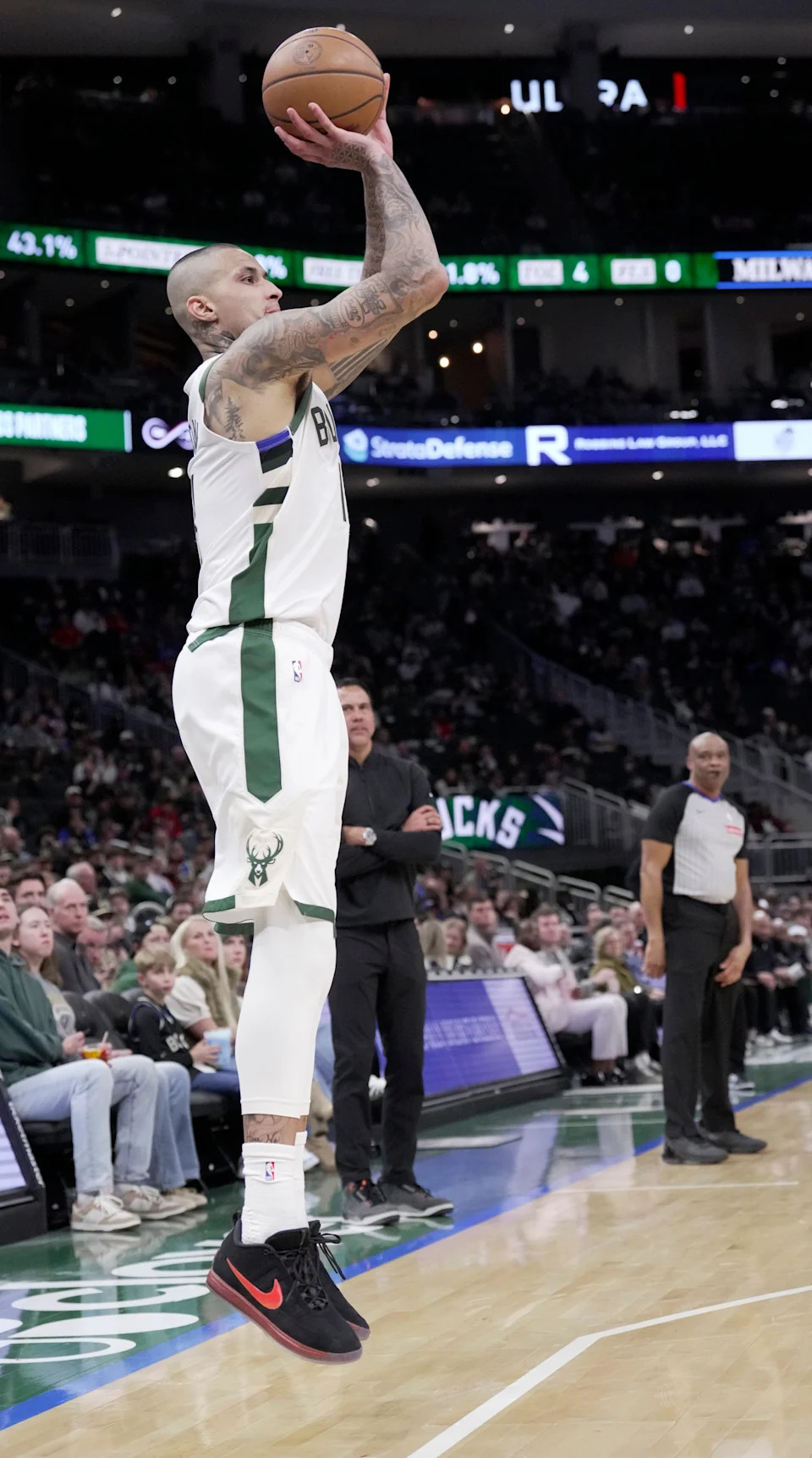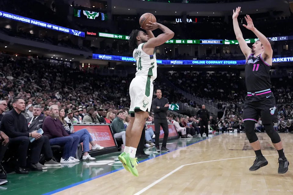 Milwaukee Bucks forward Kyle Kuzma (18) hits a three-point basket during the second half of their game Tuesday, February 24, 2026 at Fiserv Forum in Milwaukee, Wisconsin. The Milwaukee Bucks beat the Miami Heat 128-117.