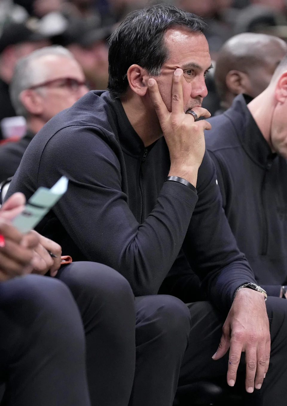 Miami Heat head coach Erik Spoelstra is shown during the first half of their game against the Milwaukee Bucks Tuesday, February 24, 2026 at Fiserv Forum in Milwaukee, Wisconsin.