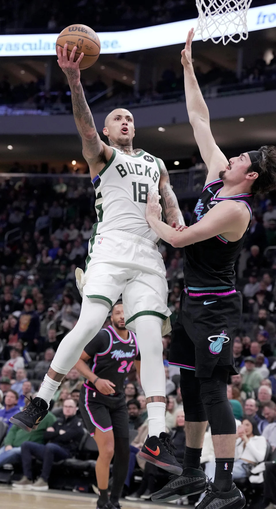 Milwaukee Bucks’ Kyle Kuzma (18) misses a shot while being guarded by Miami Heat forward Jaime Jaquez Jr. (11) during the second half of their game Tuesday, February 24, 2026 at Fiserv Forum in Milwaukee, Wisconsin. The Milwaukee Bucks beat the Miami Heat 128-117.