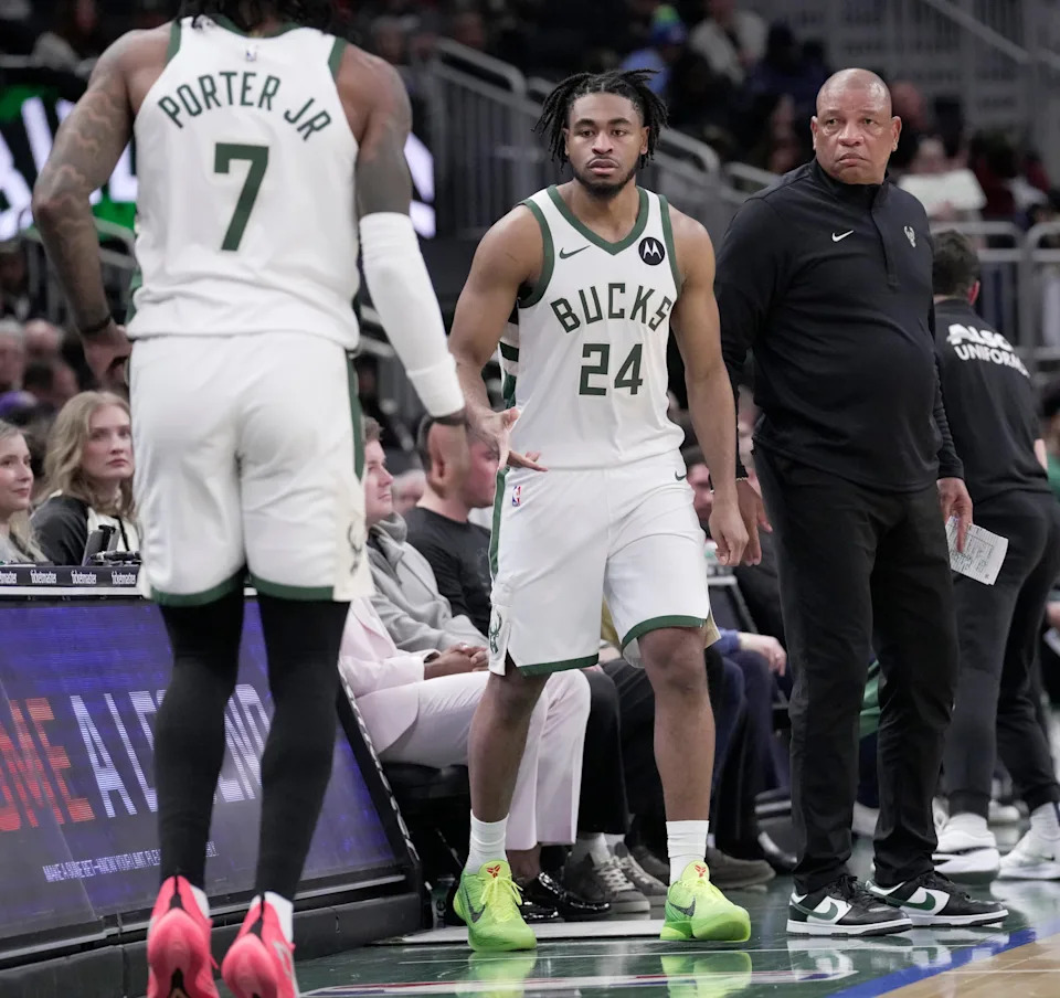 Milwaukee Bucks head coach Doc Rivers watches guard Cam Thomas (24) sub for guard Kevin Porter Jr. (7) during the first half of their game against the Miami Heat Tuesday, February 24, 2026 at Fiserv Forum in Milwaukee, Wisconsin.