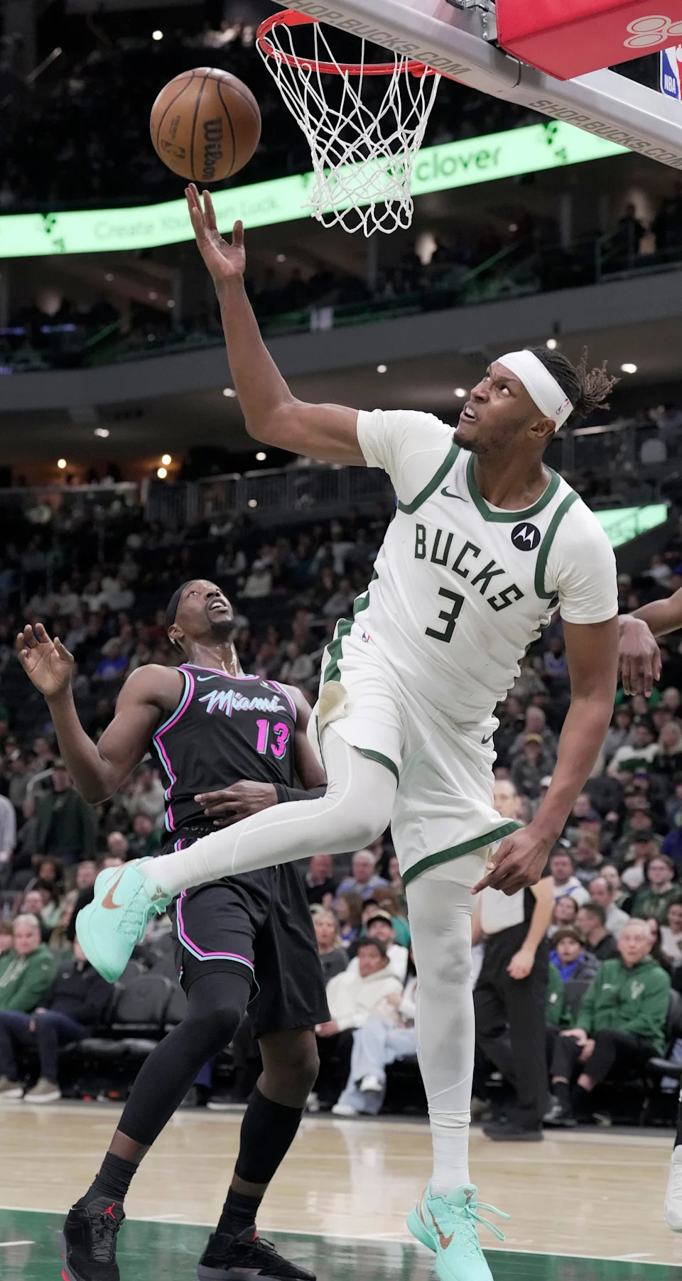 Milwaukee Bucks center Myles Turner (3) misses a basket during the second half of their game Tuesday, February 24, 2026 at Fiserv Forum in Milwaukee, Wisconsin. The Milwaukee Bucks beat the Miami Heat 128-117.