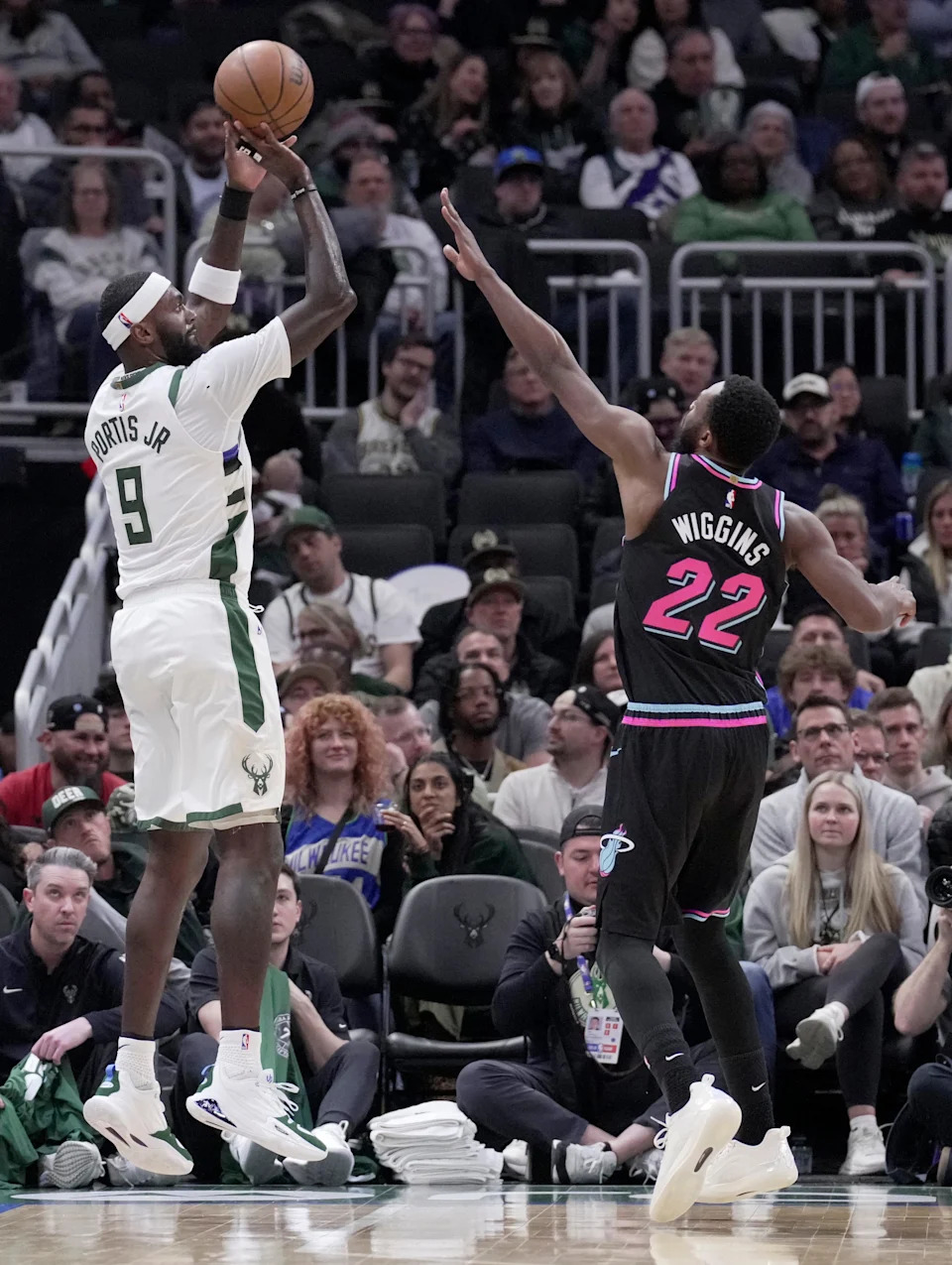 Milwaukee Bucks forward Bobby Portis (9) misses a three-point basket over Miami Heat forward Andrew Wiggins (22) during the first half of their game Tuesday, February 24, 2026 at Fiserv Forum in Milwaukee, Wisconsin.